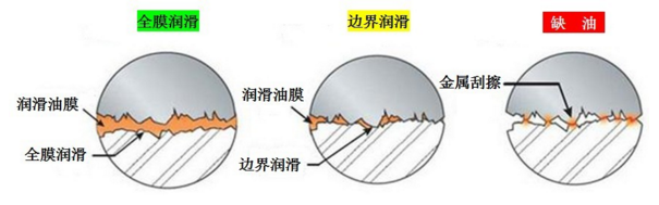 下面的圖片展示了不同的潤滑狀態(tài):圖一為潤滑充足的狀態(tài),摩擦面之間形成完整的潤滑油膜,把接觸面完全隔開;圖二為邊界潤滑狀態(tài),部分區(qū)域不能形成完整的潤滑油膜,從全膜潤滑過渡到干摩擦之間的狀態(tài),這可能是因為供油不足,或者潤滑油供應(yīng)雖然充足,但是因為某些原因,某些地方?jīng)]有得到充分的潤滑;圖三為干摩擦狀態(tài),由于缺油引起,潤滑油不能達(dá)到潤滑部位,產(chǎn)生摩擦和磨損。摩擦面之間產(chǎn)生金屬刮擦甚至燒結(jié),隨后在運(yùn)動中撕裂,造成較大的創(chuàng)面,斷裂后形成的金屬渣還會進(jìn)一步磨損設(shè)備,引起其它故障。