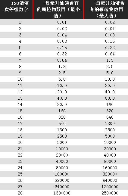 ISO清潔度等級(jí)規(guī)定了油液應(yīng)該達(dá)到多干凈,每個(gè)油樣里的顆粒物數(shù)量不同,根據(jù)檢測(cè)的顆粒物數(shù)量在哪個(gè)區(qū)間,規(guī)定為對(duì)應(yīng)等級(jí),例如測(cè)出的顆粒物數(shù)量如果在80~160個(gè)之間,那么記為14。如果≥6微米的顆粒物數(shù)量為120個(gè)/毫升,那么清潔度等級(jí)為ISO */14 /*。反過(guò)來(lái),知道ISO清潔度等級(jí),那么就可以算出顆粒物的數(shù)量應(yīng)該是多少。